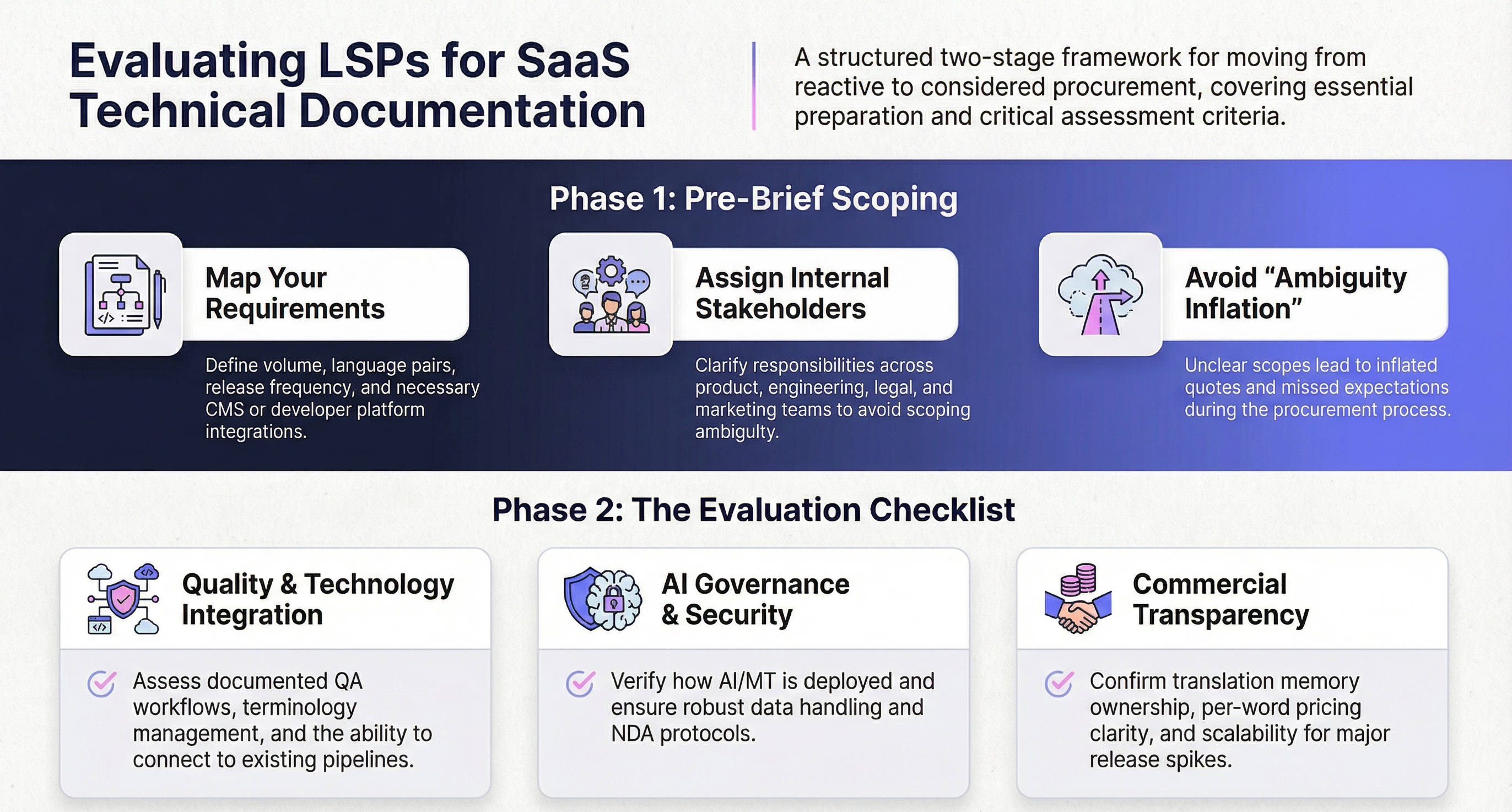 Applying structured language service provider evaluation criteria is what distinguishes a considered procurement decision from a reactive one. Below is a practical translation RFP checklist adapted for SaaS technical documentation contexts.