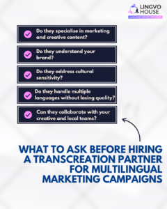 Look for partners who request creative briefs, ask to see your brand guidelines, and want to understand your campaign strategy. The best transcreation specialists often have copywriting or advertising backgrounds themselves.